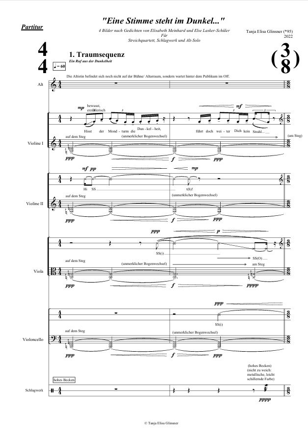 Das Werk „Eine Stimme steht im Dunkel (wie ein verschleiertes Licht)…“ basiert auf den Gedichten „Die Stimme aus dem Dunkel“ von Elisabeth Meinhard und „Ankunft“ von Else Lasker-Schüler und ist der Darstellungsversuch einer immanenten psychisch-transzendenten Tendenz ausgehend von der Emotion eines Heimwehs hin – über die Projektionsversuche – zur Heimkehr.